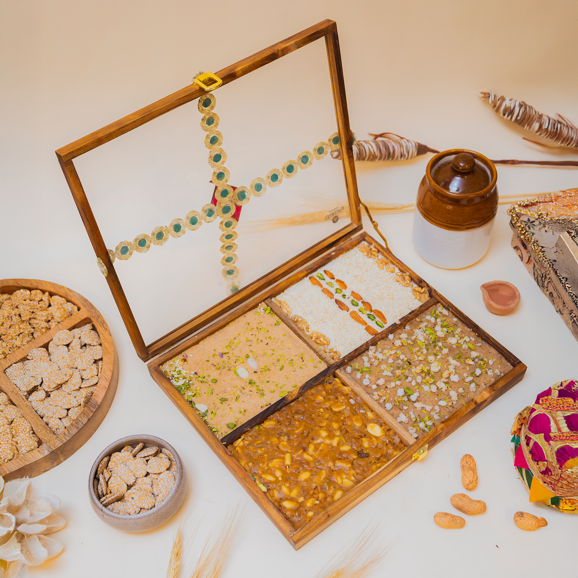 Elevate your gifting experience with our exquisite Kite Wooden Flat Box, a curated collection of traditional Indian delicacies. This elegant wooden presentation features an assortment of beloved classics: delicate Pinni Slab, nutrient-rich Til Bugga Slab, aromatic Masala Gur Slab, and nourishing Gond Pak Slab. Each handcrafted sweet reflects generations of culinary heritage, perfect for festive occasions, corporate gifting, or personal indulgence. The refined wooden packaging adds a touch of sophistication, making it an ideal choice for those who appreciate authentic flavors and premium presentation.
