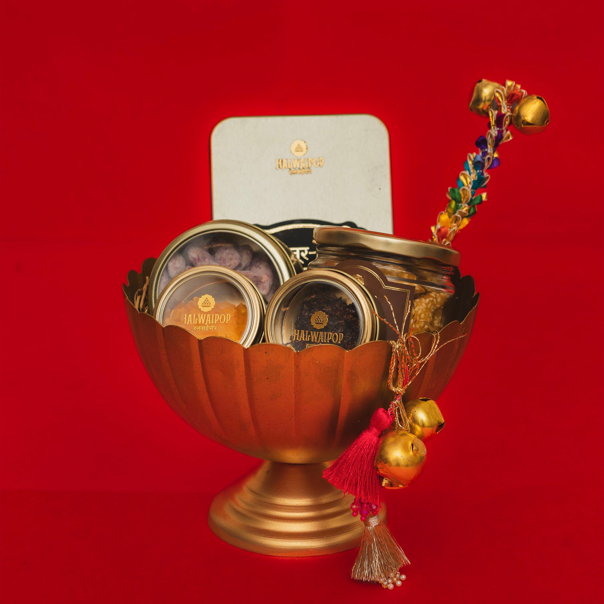 Design & Presentation — Luxe gold detailing, adorned with ghungroos and tassels; gift-ready aesthetic that stands out on any festive table.