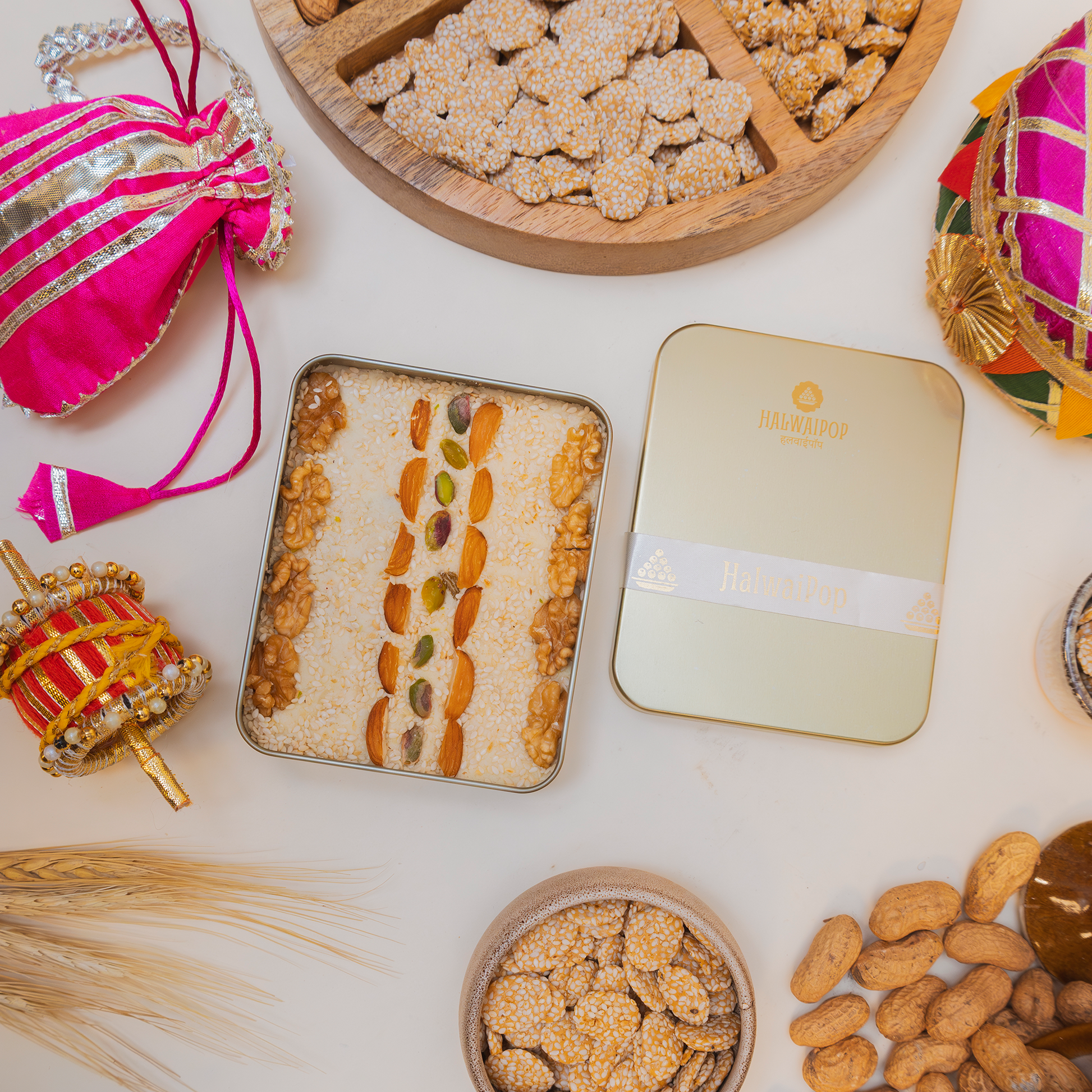 Indulge in the delicate art of traditional confectionery with our Til Bugga, a refined sesame brittle crafted to perfection. This exquisite mithai arrives in an elegant tin box, thoughtfully accompanied by a complementary spoon for effortless enjoyment and customised butter paper that preserves its authentic taste. Each piece celebrates time-honoured craftsmanship, making it an ideal gift for discerning palates or a sophisticated treat for special occasions.